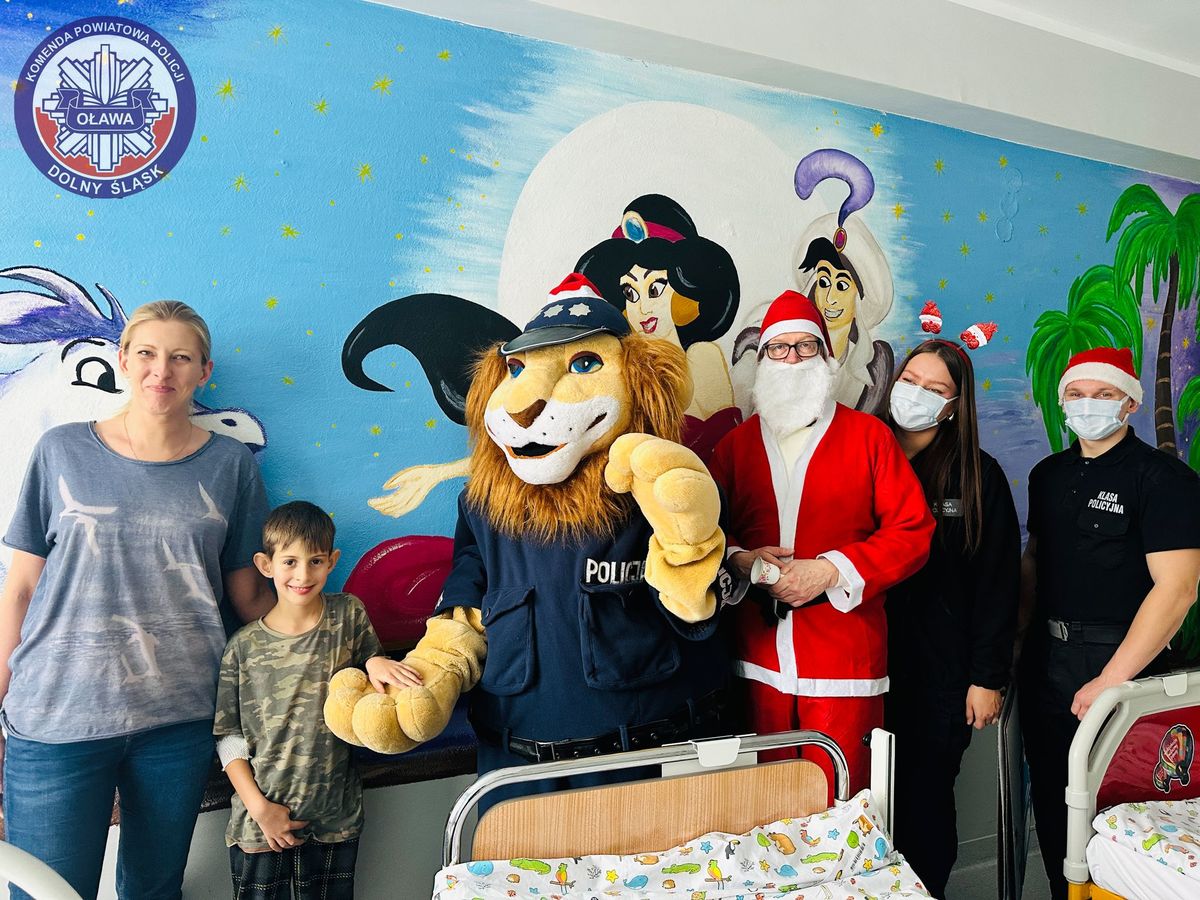 W dniu dzisiejszym, śnieżnym i zimowym ale też bardzo pięknym, bo mikołajkowym, pacjentów oddziału dziecięcego Szpitala Powiatowego w Oławie odwiedzili policjanci z Wydziału Prewencji Komendy Powiatowej Policji w Oławie wraz z maskotka dolnośląskiej policji - Komisarzem Lwem