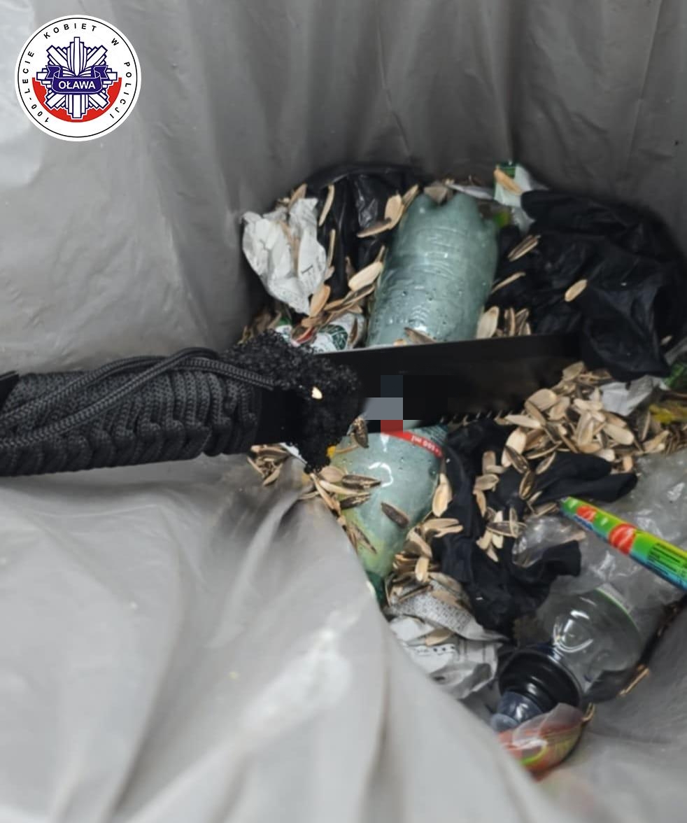 Podczas dalszych czynności policjanci odnaleźli należący do zatrzymanego plecak, a w nim maczetę, noże, kominiarki, a także kolejną maczetę wyrzuconą do kosza na śmieci.