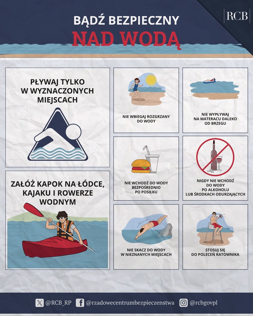 Jak podaje Rządowe Centrum Bezpieczeństwa tylko wczoraj w Polsce utonęło aż 6 osób. Pamiętaj o podstawowych zasadach bezpieczeństwa: pływaj tylko w wyznaczonych miejscach, nie wchodź do wody po alkoholu, załóż kapok będąc na łódce, kajaku i rowerze wodnym, stosuj się do poleceń ratownika oraz nie wbiegaj rozgrzany do wody. Tylko przestrzegając tych podstawowych zasad możemy sprawić, aby nasz wypoczynek nad wodą był bezpieczny i zakończył się szczęśliwe.