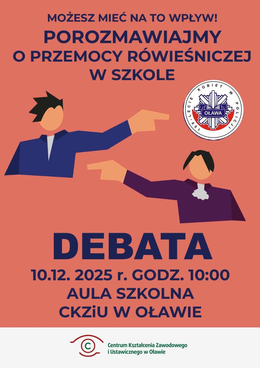 Komendant Powiatowy Policji w Oławie wspólnie z uczniami klas II i III Liceum Ogólnokształcącego z Centrum Kształcenia Zawodowego i Ustawicznego w Oławie zaprasza mieszkańców powiatu oławskiego na debatę społeczną pn. „Porozmawiajmy o przemocy rówieśniczej w szkole”. Wydarzenie odbędzie się w środę, 10 grudnia br., o godz. 10:00 w auli CKZiU przy ul. Kutrowskiego 31 w Oławie.