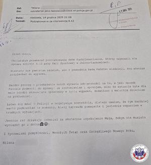 „Łatwo mówi się o Policji w negatywnym kontekście, dlatego tym bardziej warto podkreślać takie momenty, kiedy funkcjonariusze naprawdę pomagają i są wsparciem w trudnych sytuacjach” – napisała autorka podziękowań.