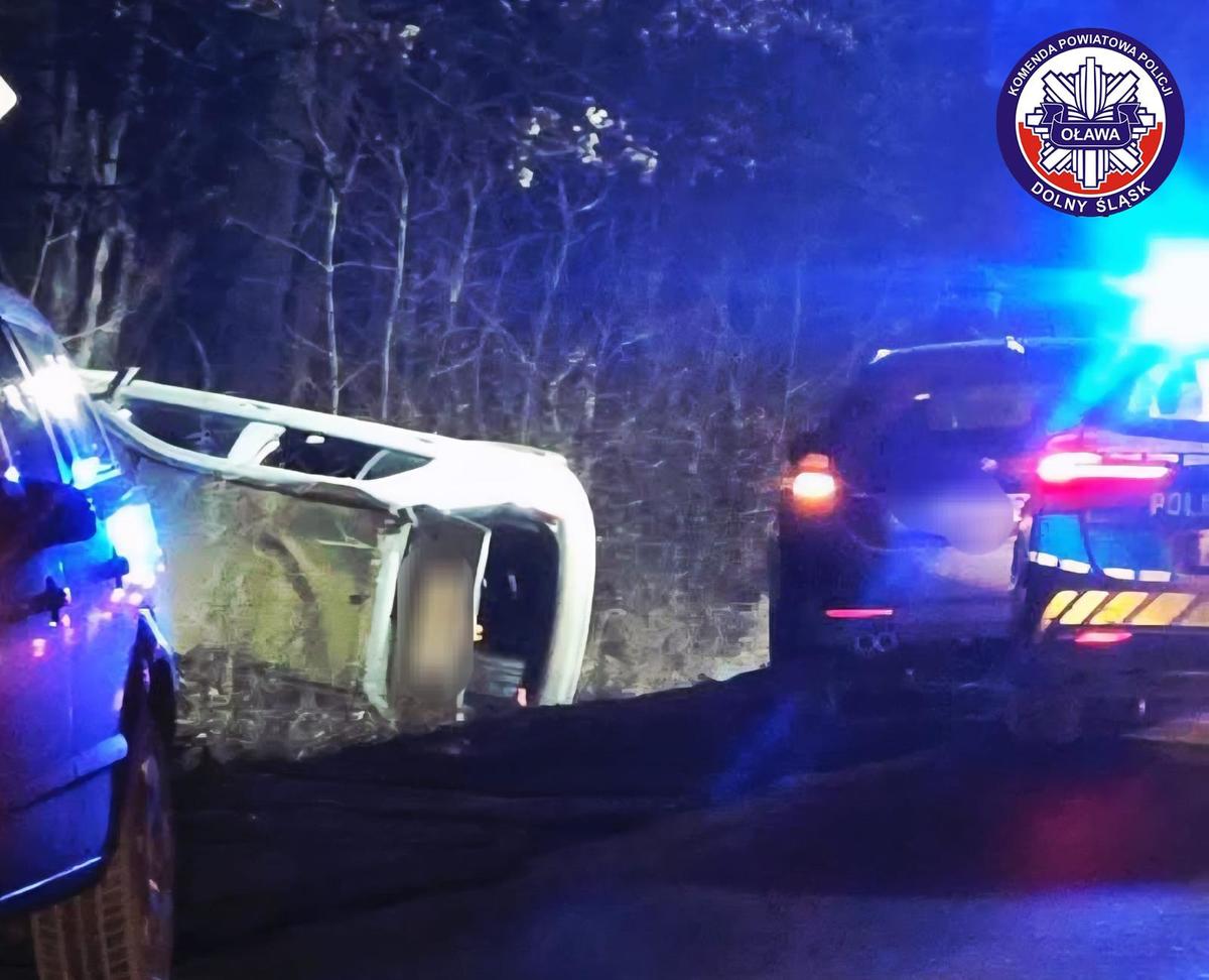 Do zdarzenia doszło w piątek, 30 stycznia br., około godziny 21:55. Dyżurny oławskiej komendy otrzymał zgłoszenie o pojeździe leżącym na boku. Sytuacja miała miejsce na ulicy Leśnej w Jelczu-Laskowicach, na drodze prowadzącej w kierunku Oławy, w rejonie leśnym przy skręcie na Janików. Na miejsce natychmiast skierowano patrol Policji.